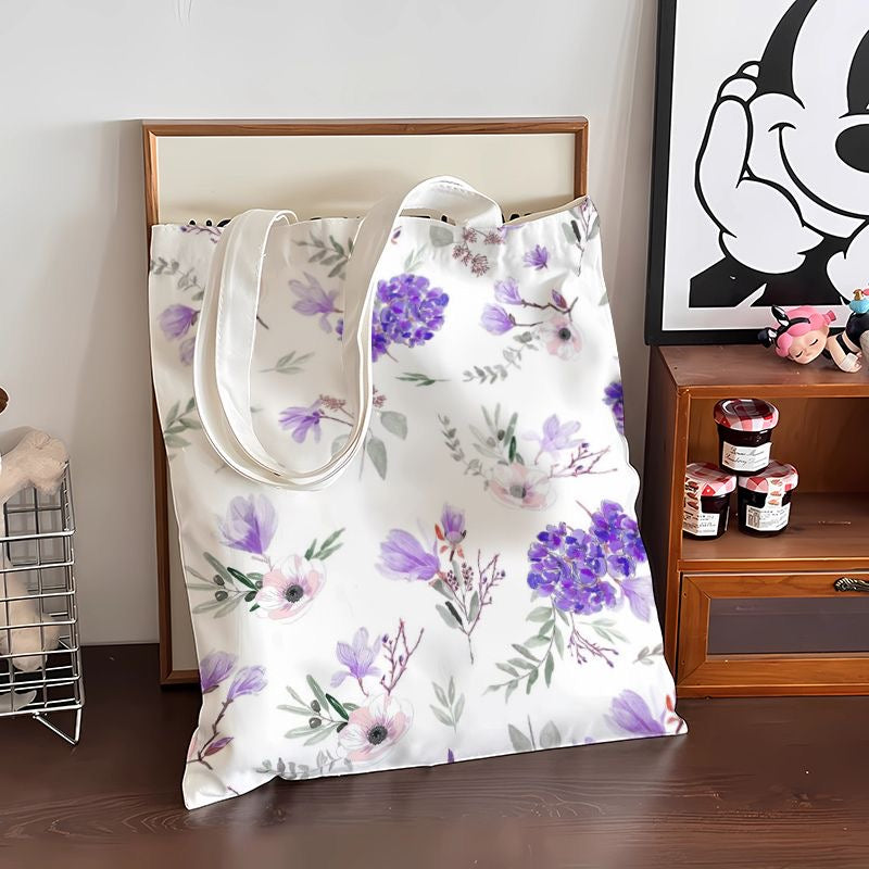 Purple floral canvas tote bag with double-sided print and zipper, 32cm x 38cm.